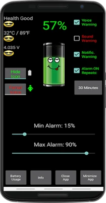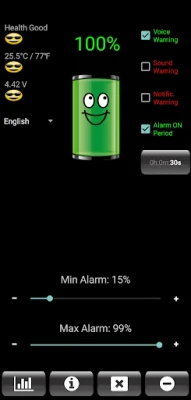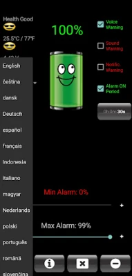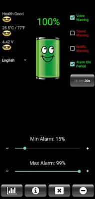 With the Battery alarm application, you can check the status of your battery. All data is obtained from your phone (temperature, current, battery status, etc ..) percentage of battery charge, battery health, current battery temperature, current battery voltage.