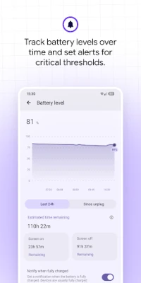 - Set customizable battery alarms and notifications.