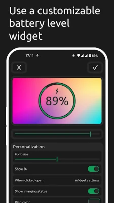 Battery One includes a sleek widget that displays your battery’s current charge level. You can resize the widget, customize its colors, and adjust text size to match your preferences. Perfect for quick access to battery stats right on your home screen.