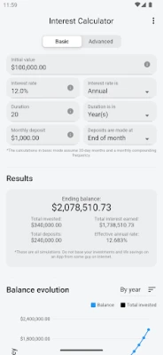 Getting started with the "Basic Mode" is easy: Just input the initial amount of money (if any), an optional monthly deposit, the interest rate and how much time you are planing to keep your capital invested. This app will then show you all the information you need in a beautiful graph, accompanied by a detailed analysis for the selected period.
