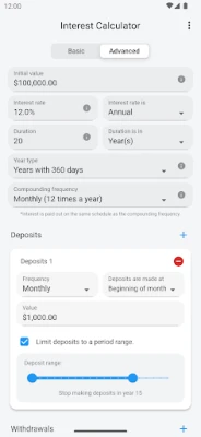 For more customization, the 'Advanced Mode' offers additional features: You can add multiple deposits and withdrawals over time, choose different compounding frequencies (such as daily or quarterly), and adjust the number of days in a year. For example, you can simulate a scenario where you make significant monthly deposits for 30 years, and then begin making annual withdrawals of a percentage of the balance. This calculator is that flexible.