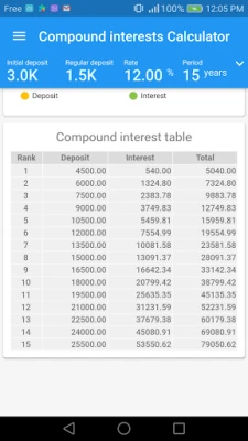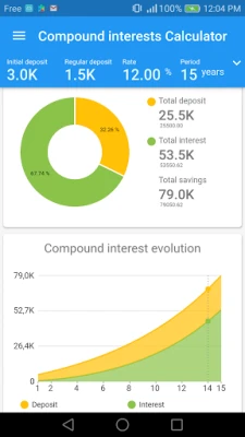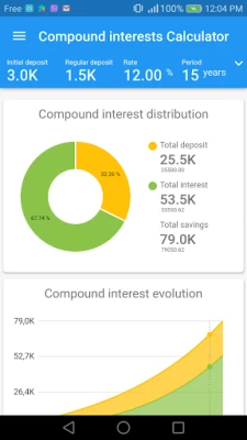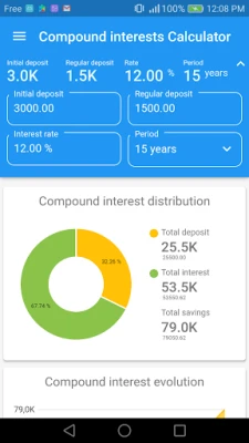 - Simply entry investment values - Instant calculation result - Breakdown graph of cumulative deposits and interest - Compound interests graph over time for each period - Table of cumulative interest and savings for each period