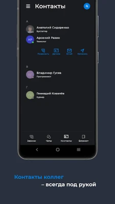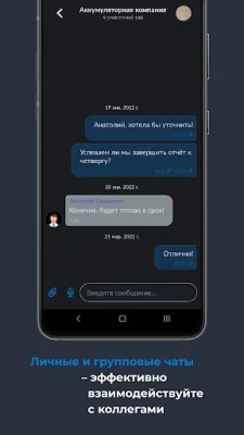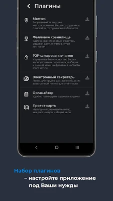 In the basic version of the application, a general company chat is available, as well as group and personal chats, personal audio and video calls, and a notepad. Additional functionality can be activated via plugins (in development): - P2P encryption of transmitted data - Shared file storage - Employee location monitoring - Duplicate chat messages via email - Organizer - Project map