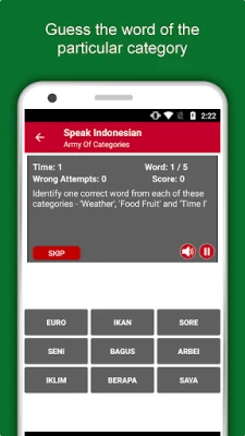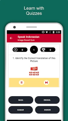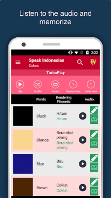 The offline Indonesian learning app has 2,135 words with 55 categories. It contains pronunciation, images and phonetics of words for easy learning. Switch base language, Save learnings in EduBank℠, audio play, Potpourri and retention games are the main features of Speak Indonesian app.