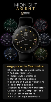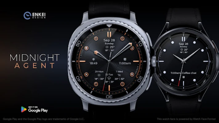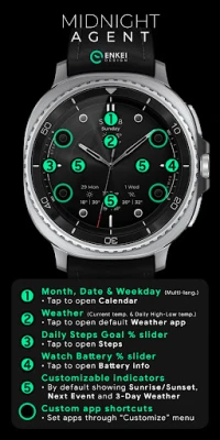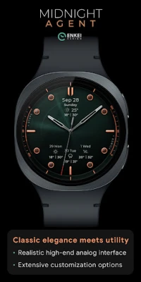 Midnight Agent is a luxurious classic analog watch face with built-in Weather indicators.