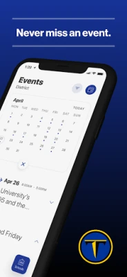 NEVER MISS AN EVENT The event section shows a list of events throughout the district. Users can add an event to your calendar to share the event with friends and family with one tap.