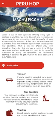 Get up-to-date news, information and travel tips from Peru Hop, the safe, fun and flexible way to travel in Peru. Our award-winning buses offer hop on hop off service throughout Peru with free extra tours along the way to help you discover the real Peru. Passes are valid for one full year, allowing you to enjoy Peru’s best places at your own pace. Use this convenient app to access everything you need to know during your trip, and take advantage of our exclusive city guides for the best insider information about each destination along your itinerary.